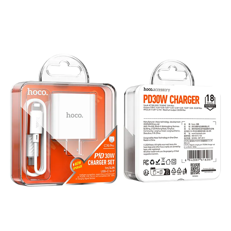 Bộ Sạc Kèm Dây C to iP Hoco C76 Pro Majestic PD30W (US) là bộ sạc nhanh công suất 30W với dây Type-C to Lightning dài 1m, chất liệu PC+ABS chống cháy giúp an toàn tối ưu. Kích thước nhỏ gọn 59x42x27mm, trọng lượng 78g, thích hợp mang theo mọi lúc. Sản phẩm chuẩn Mỹ, bảo hành 12 tháng, đổi trả dễ dàng, giao hàng toàn quốc hỗ trợ phí ship. Đây là lựa chọn lý tưởng cho iPhone của bạn với độ bền cao và sạc nhanh ổn định.