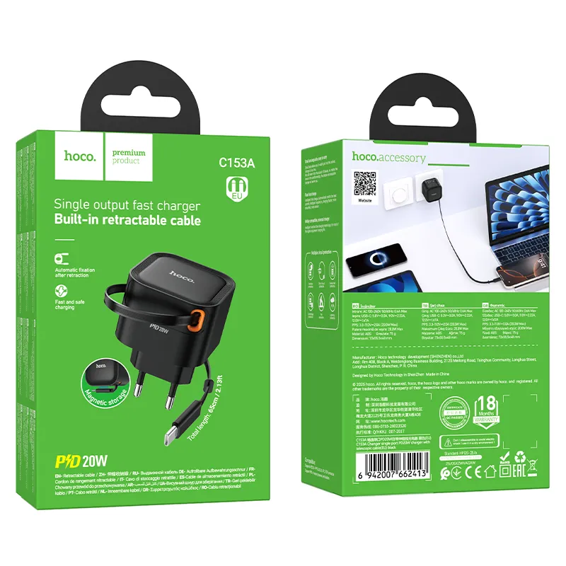 Hình Ảnh sản Phẩm: Củ Sạc PD20W Hoco C153A Changer có dây kéo EU – Sạc nhanh 20W, tích hợp cáp kéo tiện dụng, mua ngay củ sạc chính hãng