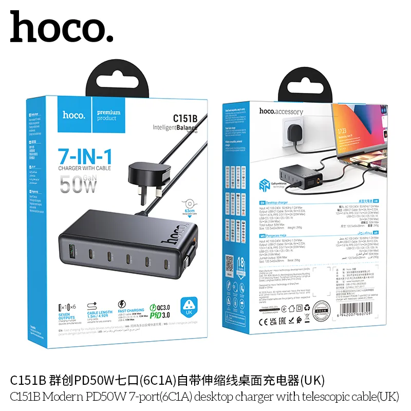 Product Details: C151B Modern PD50W 7-port(6C1A) desktop charger with telescopic cable(UK)