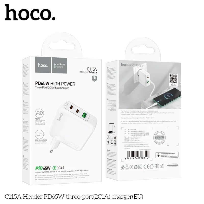 Củ Sạc PD65W GaN Hoco C115A Header 3 cổng (2C1A) (EU) sạc nhanh, hỗ trợ phí giao hàng, bảo hành 12 tháng, đổi trả dễ dàng, nhà phân phối uỷ quyền chính hãng tại Việt Nam, full VAT đảm bảo uy tín