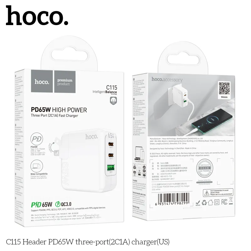 Hình Ảnh sản Phẩm: Củ Sạc PD65W Hoco C115 Header 3 cổng (US) – Sạc nhanh đa thiết bị, an toàn, mua ngay chính hãng