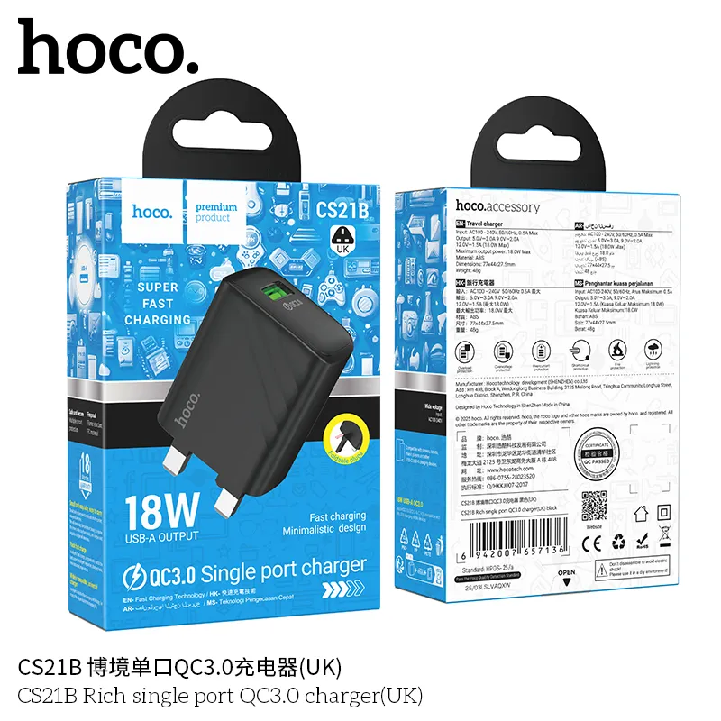 Product Details: CS21B Rich single port QC3.0 charger(UK)