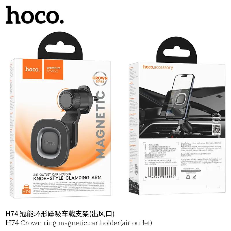 Giá Đỡ Ô Tô Hoco H74 Crown Ring (Air Outlet) làm từ ABS và silicone, thiết kế hoa văn phơi nắng chống trơn, kích thước 98x60x99mm, trọng lượng 75g. Phù hợp điện thoại 4.5-7 inch, đặc biệt iPhone 12-16 series, dùng gắn trên cửa gió điều hòa ô tô, giúp giữ điện thoại chắc chắn, tiện lợi khi lái xe.