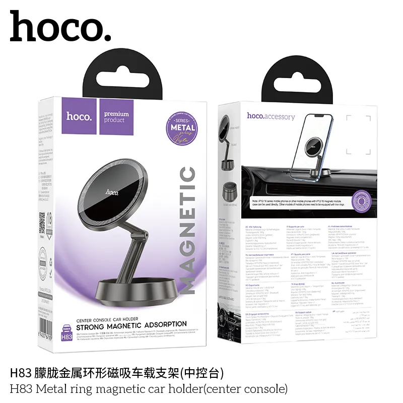 Giá Đỡ Ô Tô Hoco H83 Metal Ring (Center Console) là giá đỡ kim loại hợp kim kẽm mạ điện, kích thước 65*65*52,5mm, trọng lượng 159g. Phù hợp điện thoại 4,5-7 inch, đặc biệt iPhone 12-16. Lắp đặt dễ dàng trên bảng điều khiển trung tâm ô tô, giúp cố định chắc chắn điện thoại khi lái xe, an toàn và tiện lợi. Hoco chính hãng, bảo hành 12 tháng, hỗ trợ đổi trả nhanh, giao hàng toàn quốc với phí giao hàng hỗ trợ. Đối tác phân phối uy tín tại Việt Nam, hàng có VAT đầy đủ, lợi nhuận cao cho đại lý.