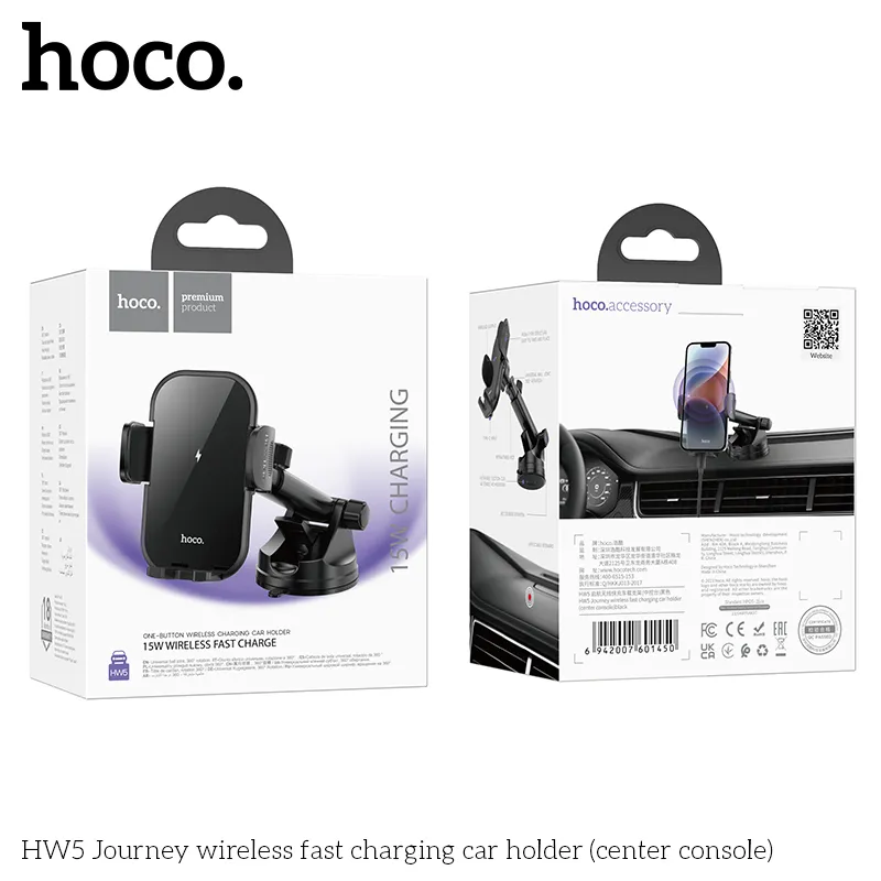 Giá Đỡ Ô Tô Sạc Không Dây Hoco HW5 Journey (Center Console) làm từ PC+ABS cao cấp, hỗ trợ sạc nhanh 15W, kích thước 175*64*111mm phù hợp điện thoại 4.5-7 inch, trọng lượng 192g. Sản phẩm thiết kế chắc chắn cho ô tô, dễ dùng, giao hàng toàn quốc, đổi trả linh hoạt, bảo hành 12 tháng, nhà phân phối uỷ quyền chính hãng tại Việt Nam. Đảm bảo lợi nhuận cao cho đại lý và uy tín chất lượng cho người dùng.