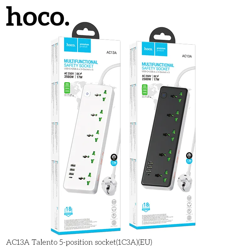 Hình Ảnh sản Phẩm: Ổ Cắm Thông Minh Hoco AC13A Talento 5 cổng (1C3A) (EU) – An toàn, đa cổng, sạc nhanh – Mua ngay, giao hàng toàn quốc