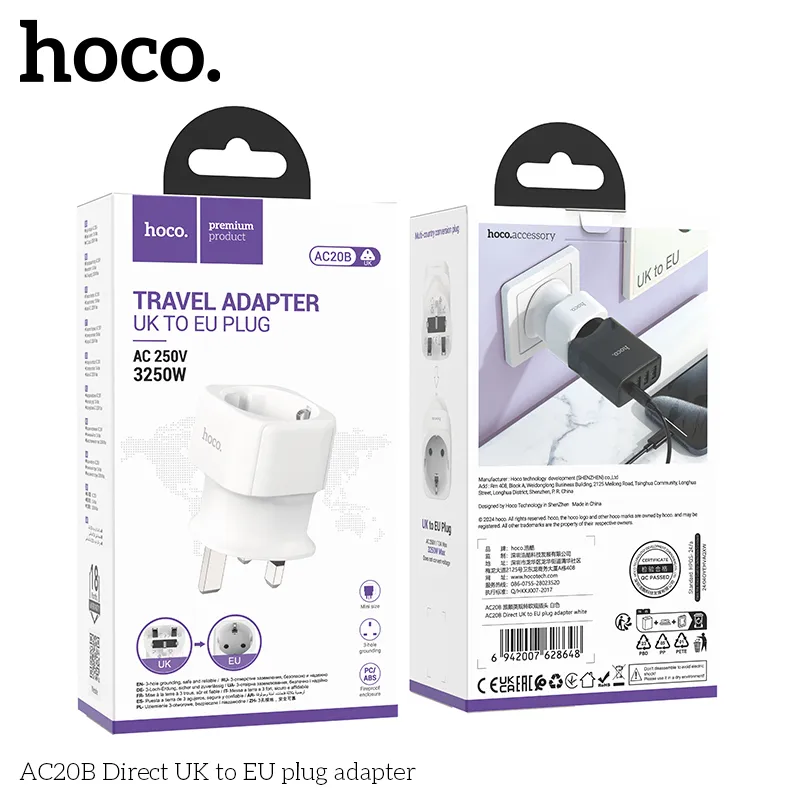 Hình Ảnh sản Phẩm: Ổ Cắm Thông Minh Hoco AC20B Direct UK to EU Plug Adapter – Công suất cao, an toàn tuyệt đối, mua ngay