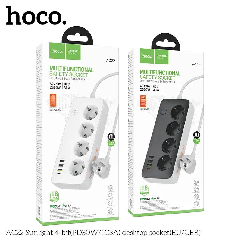 Ổ Cắm Thông Minh Hoco AC22 Sunlight 4 cổng PD30W (1C3A) (EU/GER) với thiết kế PC+ABS chống cháy, gồm 4 chấu công suất 2500W, cổng Type-C 30W và USB-A đa năng. Kích thước 211x88x40.5mm cùng trọng lượng 430g tạo sự tiện lợi. Dây cáp dài 1.5m hỗ trợ sạc nhanh nhiều thiết bị cùng lúc, bảo vệ an toàn, tối ưu trải nghiệm người dùng.