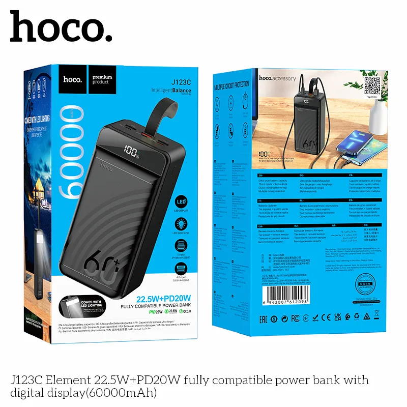 Hình Ảnh sản Phẩm: Pin Dự Phòng Hoco J123C Element 22.5W+PD20W tương thích đầy đủ kèm màn hình kỹ thuật số 60000mAh – Sạc nhanh an toàn, chuẩn chính hãng, mua ngay
