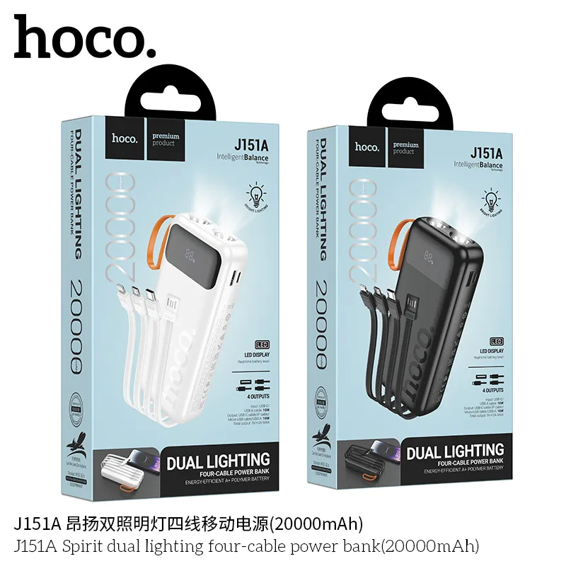 Hình Ảnh sản Phẩm: Pin Dự Phòng Hoco J151A Spirit Dual kèm đèn và 4 cáp 20000mAh – Sạc nhanh đa cổng, chính hãng Hoco, mua ngay tại Việt Nam