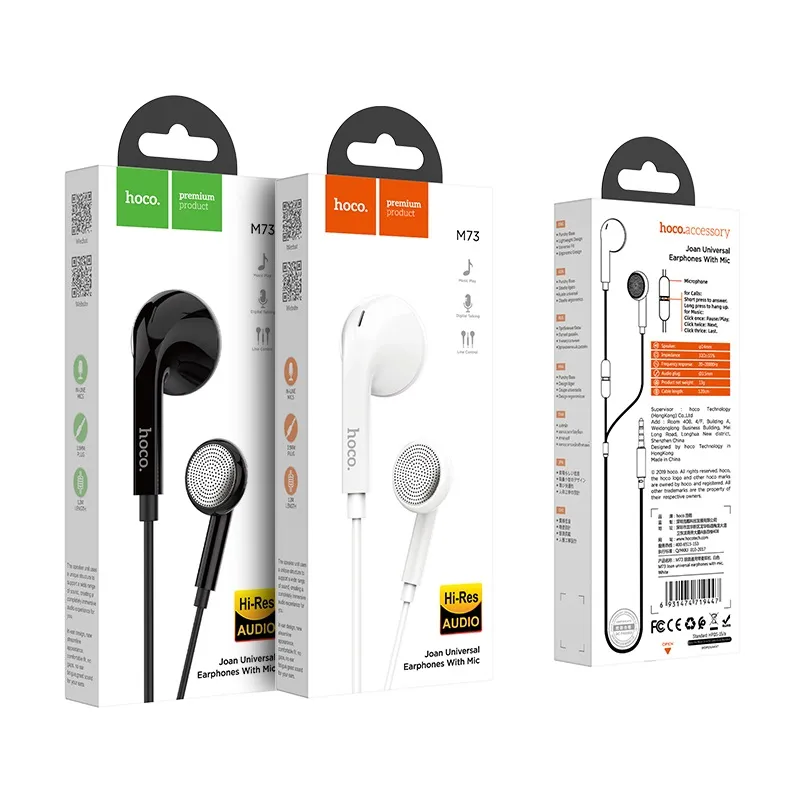 Tai Nghe Có Dây 3.5mm Hoco M73 Joan universal với loa 14mm cho âm thanh chân thực, dây TPE dài 1.2m bền bỉ, nhẹ 13g vừa vặn, micro tích hợp và điều khiển nút đơn giúp bạn nghe gọi tiện lợi và tận hưởng âm nhạc sống động mỗi ngày.