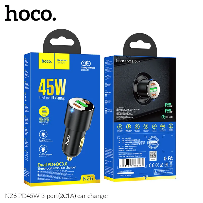 Tẩu Sạc Ô tô Hoco NZ6 PD45W sử dụng hợp kim nhôm và PC chống cháy, kích thước nhỏ gọn 62x26mm, trọng lượng 43g. Công suất đầu ra gồm 3 cổng với tổng PD45W, tương thích Samsung PD25W và Apple 20W, giúp sạc an toàn nhanh chóng trên mọi hành trình. Thiết bị tối ưu cho người dùng ô tô cần sạc đa thiết bị hiệu quả, uy tín từ thương hiệu Hoco.