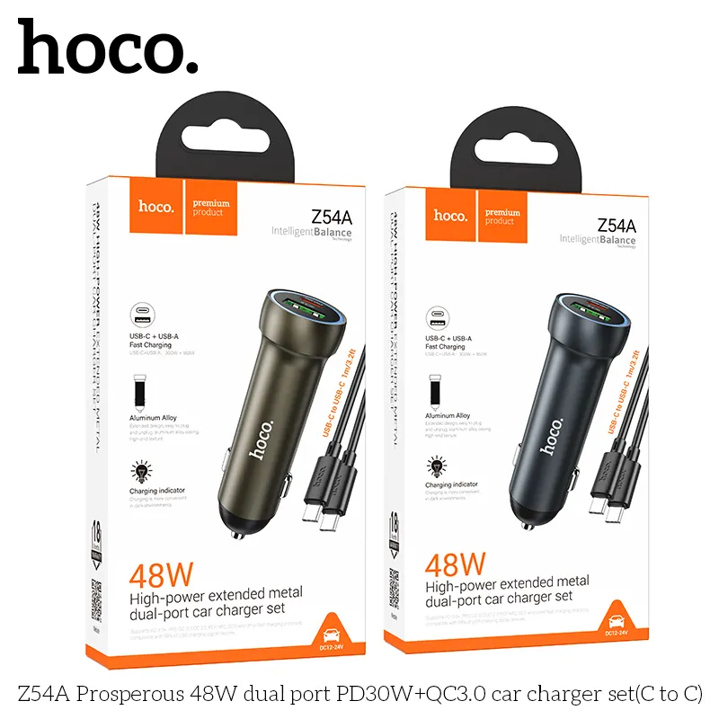 Product Details: Z54A Prosperous 48W dual port PD30W+QC3.0 car charger set(C to C)